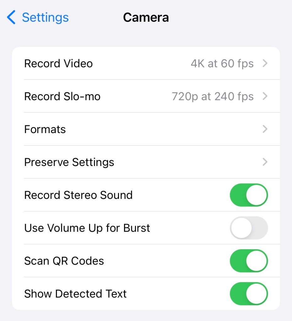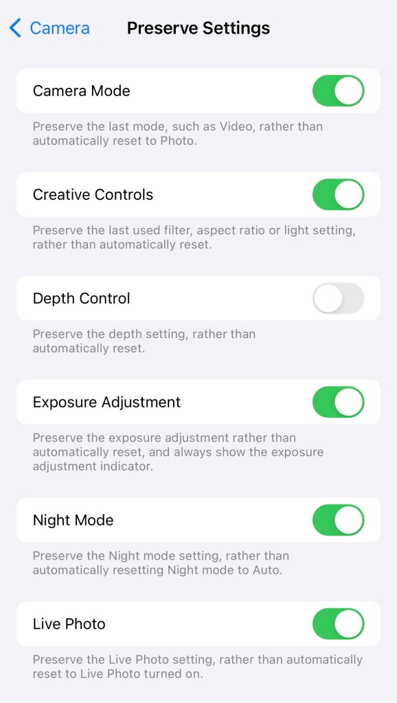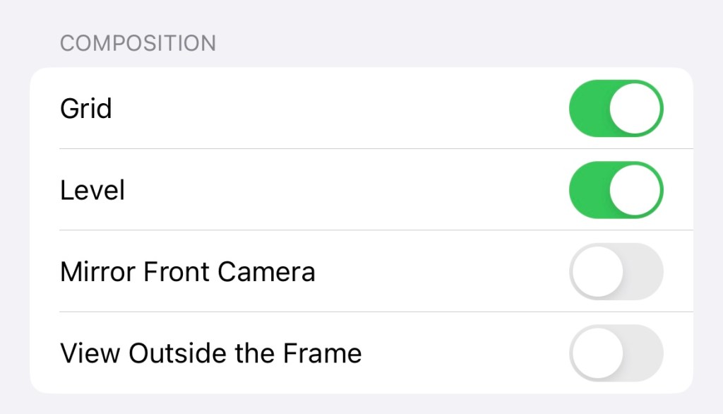 1 – go to “Settings” on your iPhone and scroll down to “Camera“2 – Click on “Preserve Settings“3 – toggle on all the options except Depth Control. 4 – go back and go to Composition. Toggle on Grid and Level, and toggle off Mirror Front Camera and View Outside the Frame.